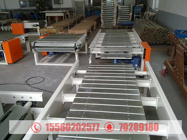 板鏈輸送機(jī)適用于形狀不規(guī)則物品的重載輸送。鏈條選用空心大輥?zhàn)訋Ц郊湕l,在兩側(cè)同步鏈條的附件上用板狀構(gòu)件連接使輸送方向形成連續(xù)的平板,因而運(yùn)行平穩(wěn)。該機(jī)與鏈?zhǔn)交蜉佂草斔蜋C(jī)配合使用可實(shí)現(xiàn)轉(zhuǎn)角輸送。